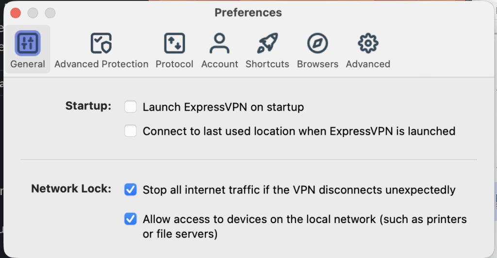 Dessutom erbjuder ExpressVPN en så kallad Kill Switch som förhindrar att din IP-adress blir synlig i det ögonblick som uppstår om du skulle tappa uppkopplingen till VPN-servern som du är ansluten till. Enligt vår erfarenhet är en Kill Switch av yttersta vikt för att kunna ägna sig åt torrenting anonymt och säkert.
